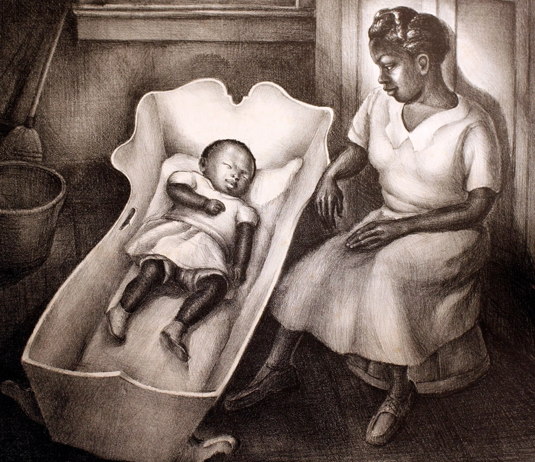 Here is a sweet and tender moment between mother and child. This piece is a black-and-white lithograph. Lithography is an old method of printing images or words onto a surface such as paper. Lithography is similar to modern digital printing in that it was a way to produce multiple copies of media. Think of this as a small scale and less technical copy machine. Unlike using a copy machine, this is no simple process. Originally, the image was drawn on a stone with a smooth surface before being processed into a lithograph. This lithograph portrays Elizabeth Moaney, who worked for the family of Ruth Starr Rose, and through her devotion soon became part of the family. The cradle in which the baby is sleeping was given to Elizabeth by the Starr family and can be found at the Water’s Edge Museum.