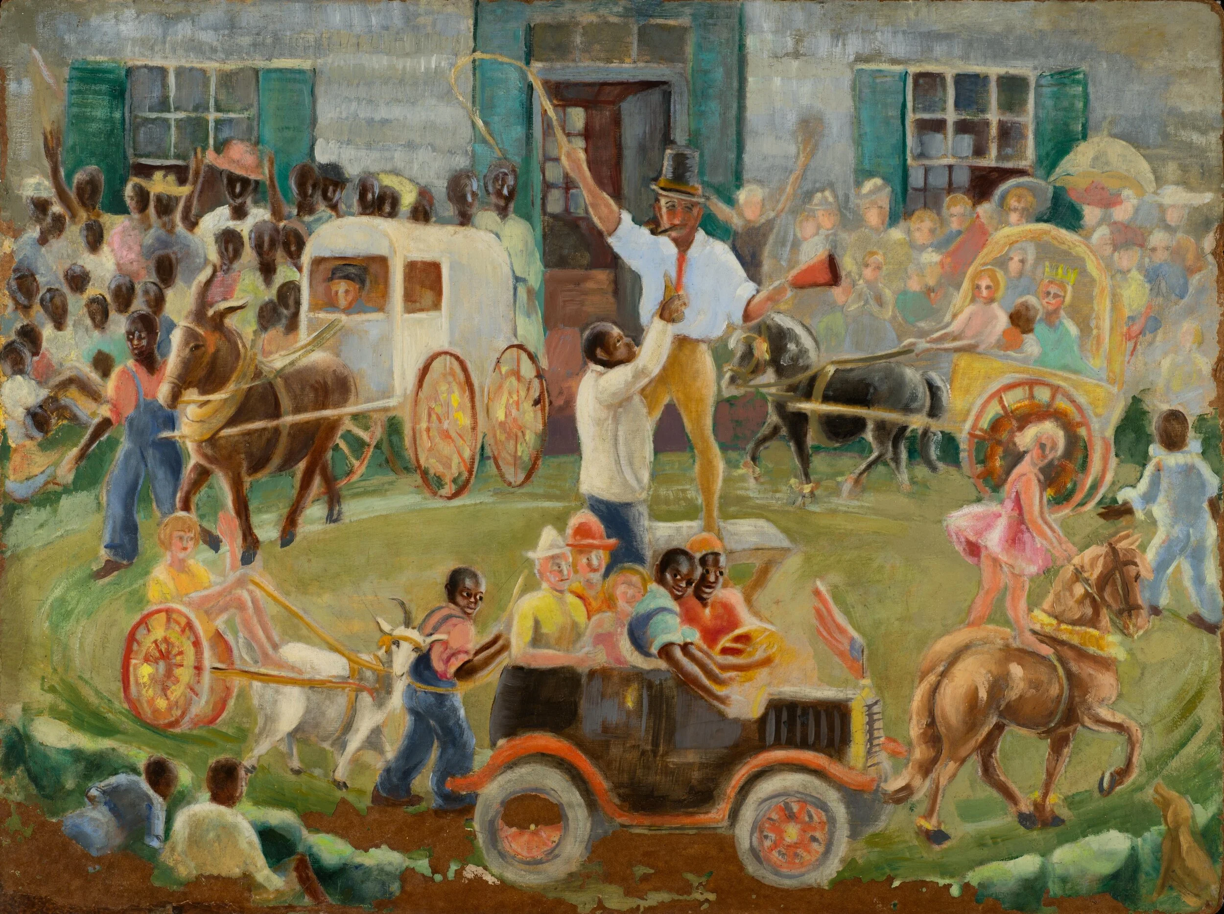 This vibrant oil painting, full of color and energy, represents a foreseeable future of justice and equality. The scene is in front of the old Talbot County Courthouse, which is significant because it is presumed to be a place of justice and equal rights. The man standing in the middle, the “ringmaster,” is the artist's husband. The man below him appears to be holding a bottle and offering him a refreshment. Rose and her husband were known for entertaining all people from the community. Perhaps this image is a statement about the prevailing racial inequality at the time, because the crowd of on-lookers is noticeably segregated. This crowd is watching what appears to be a roundabout of carts and carriages filled with Black and White people. The roundabout gives off a feeling of unity and integration. Could the circular motion of the integrated carts represent a movement towards future equality?