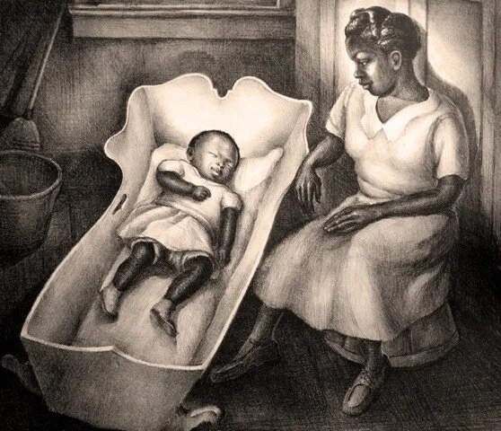 This print was made to show the “power and emotion” of a mother as she watched over her sleeping baby. The child is in an expensively made cradle, while the mother sits watching protectively while crouching on an overturned peach basket. Her focus and calm is what stands out most of all in this beautiful lithograph.
