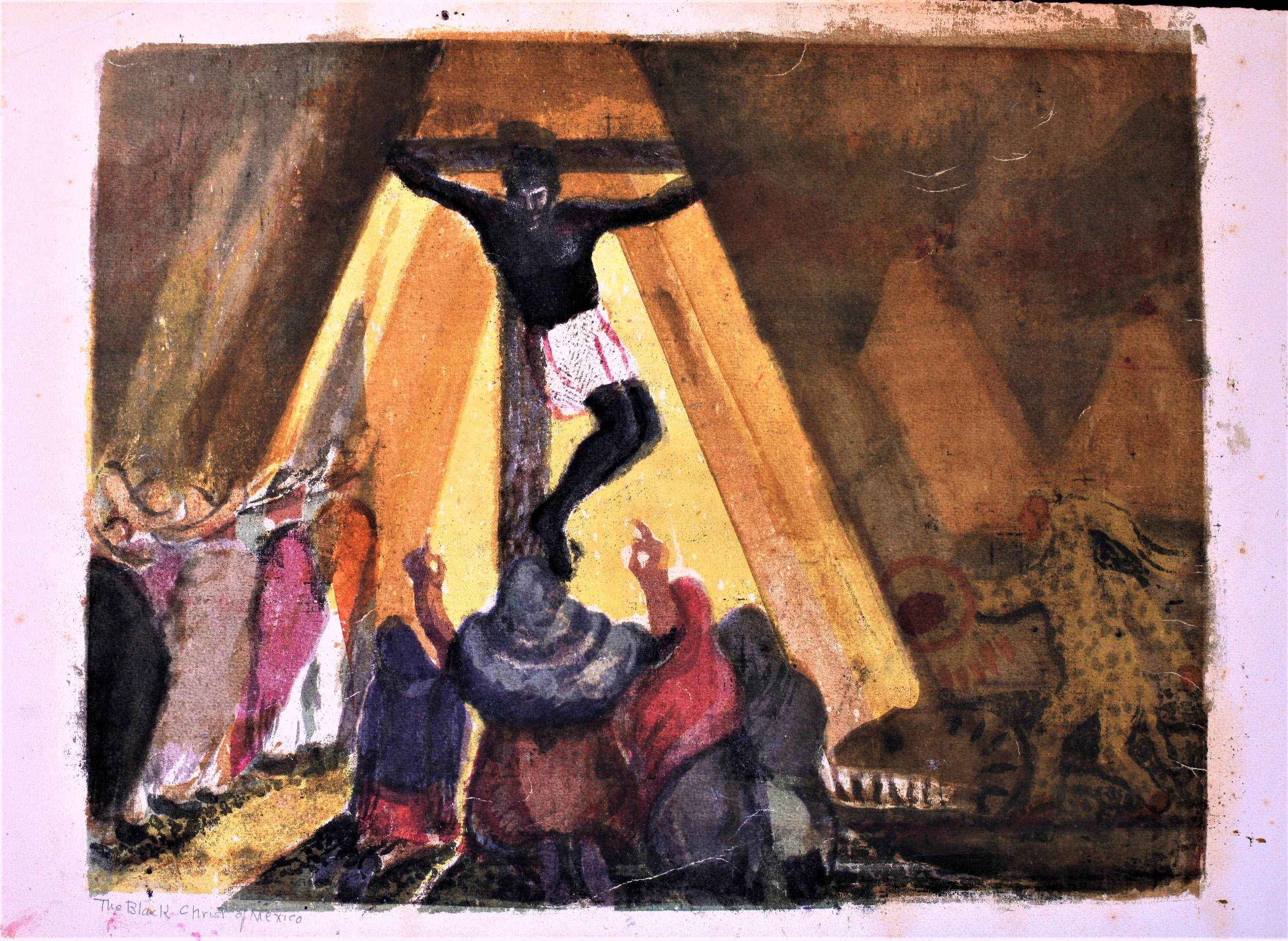 Rose’s impressive work goes to the heart of the matter in her quest to understand the spirituality of Mexicans, from sophisticated urban dwellers who worshiped the Black Christ of Mexico presented in the Cathedral of Mexico City, to rural Easter carnivals and religious celebrations in Ajijic, to the Purepecha tribe in the mountains above her home. As an anthropological artist, she was fascinated by the Purepecha women, and was proud of how they retained their ancestral lands and also how much they put their trust in her when taking her to ancient ritual sites. Above all others, the reclusive Purepechas were the people whom she became close to over her two-year residency in Jalisco, and she wrote, “I gained the confident friendship of the Tarascan Indians, who took me to many of their half-pagan, half-Christian ceremonies in remote places in the nearby mountains.”