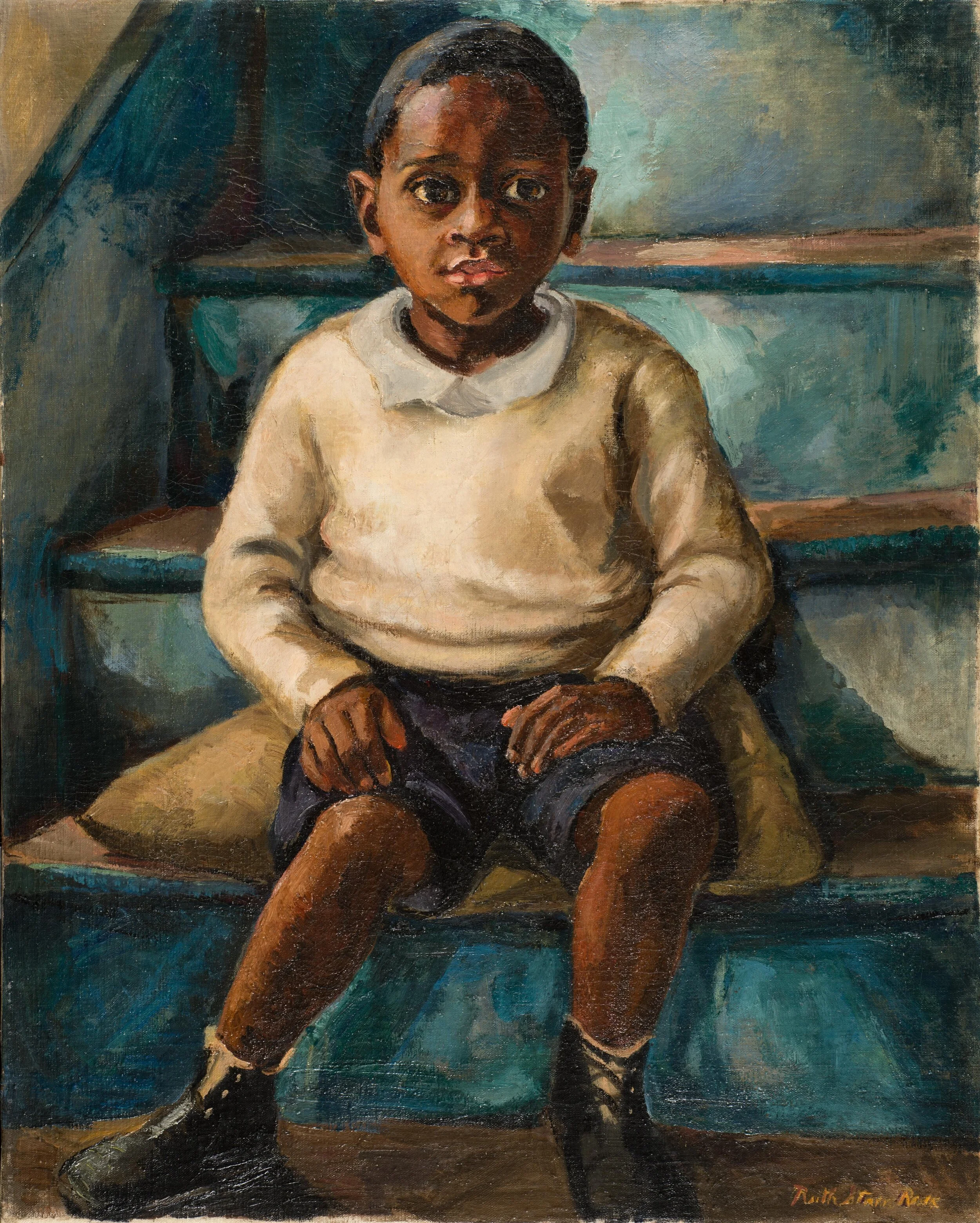 This arresting portrait of a younger member of the Moaney family perched on the back steps of the Pickbourne Farm kitchen near Tunis Mills on the Eastern Shore. In this finished oil painting, as well as in the preparatory drawings, the artist seems to be working out the relationship between herself and a child whose mother works in service for her family. The resulting trust and patience granted to the artist by the young child is a testament to their genuine relationship, and the boy’s sense of peace and inner security in his environment. His large, earnest eyes directly engage the viewer, while the full-length portrait shows his tiny frame and small booted feet resting on the step below him. He is shown in a sweater and collared shirt, contented, clean, and well fed—a stark contrast to the racist depictions of wildly unkempt black children by many of the artist’s contemporaries.