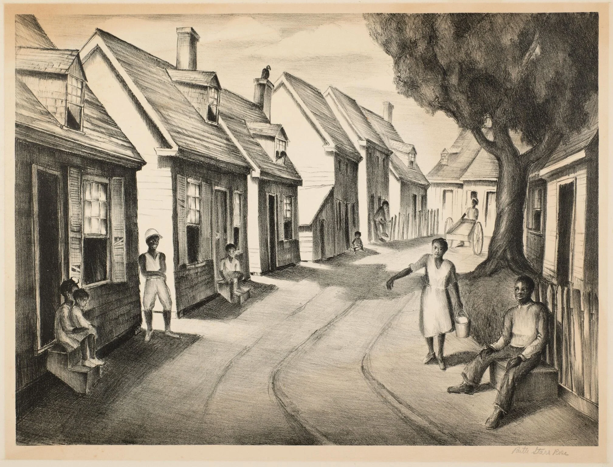 3.Share this information about the lithograph with your class: This lithograph shows life on the Eastern Shore almost one hundred years ago. Many people of color lived and gathered on this street in St. Michaels. Notice the neatly kept homes and neighborly attitude of the subjects in the lithograph. As with most of the streets of St. Michaels at that time, there is an unpaved lane weaving through their neighborhood. The people depicted here are part of an “underrepresented” community. This means that communities of color such as this one got very little attention and reward for their strength and hard work. This snapshot into that world is what makes this piece of art so unique and important.